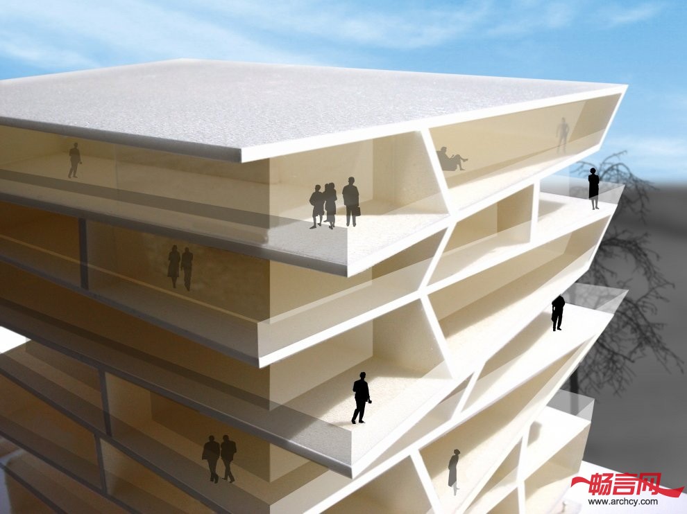 “为了让新建筑能融入到周围建筑环境之中,我们将它设计成两种类型组合而成的建筑,这两种类型分别是‘水畔大楼’和‘城市叠层楼’”