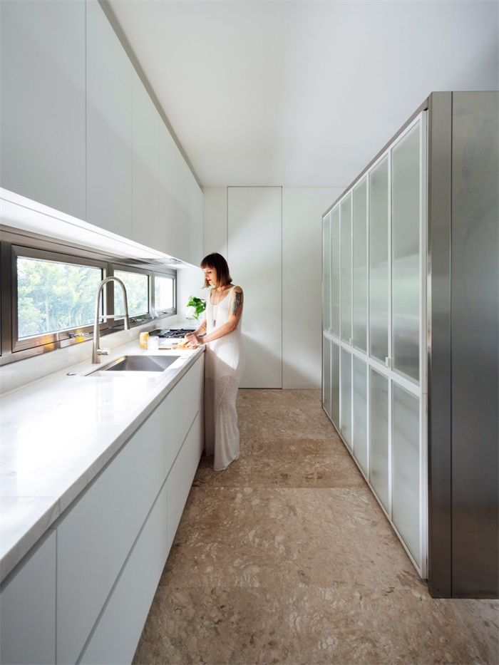 项目位于巴西南部地区,Arquitetura Nacional事务所设计的这座住宅的立面上,点缀着白色钢筋混凝土板和圆柱形、开口和百叶窗。Casa Ventura住宅外立面由玻璃纤维和白水泥组成,面板被斜切口穿透,为室内引入自然光。住宅内部的连杆打开百叶窗后,露出后面的玻璃窗。
