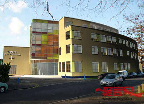 圣三一学院去年被评为伦敦第四所最创新的学校,和英国国教关系密切,具有很浓的基督精神。新校舍可容纳600名学生,完全取代了原先的1957年的校舍。新建筑拥有两层高的中庭和色彩鲜艳的玻璃入口,有望成为当地标志性建筑。该设计的独特之处在于很少使用直线线条,总的来说是“曲中有曲”;另个一特点是建筑物的屋顶种满了植被,可收集雨水用于灌溉。该建筑有望获得建筑研究院环境评审法的卓越等级。