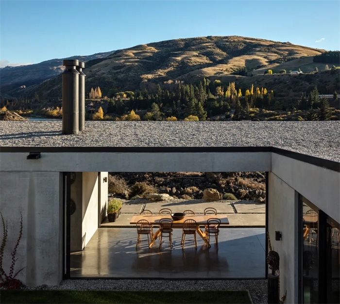设计受岩石地形的启发,将预制混凝土墙作为主要的墙体结构形式。平缓倾斜的屋顶上覆盖着从现场取材的石块,强调了将房屋牢牢扎根于景观之中的理念。