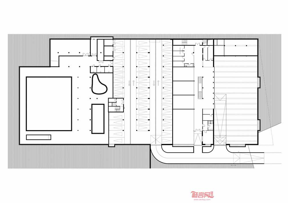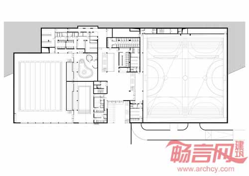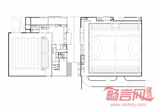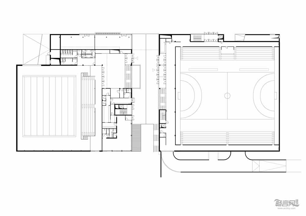 从体育中心的一层平面图看,体育场的结构非常简单。体育场一层区域由两个相同的方形区组成,其中一个包含了拥有正面看台的体操场,另一个涵盖了呈现“L”型的泳池及附属设施。两个区域相互独立,通过一个公共流通区连接。