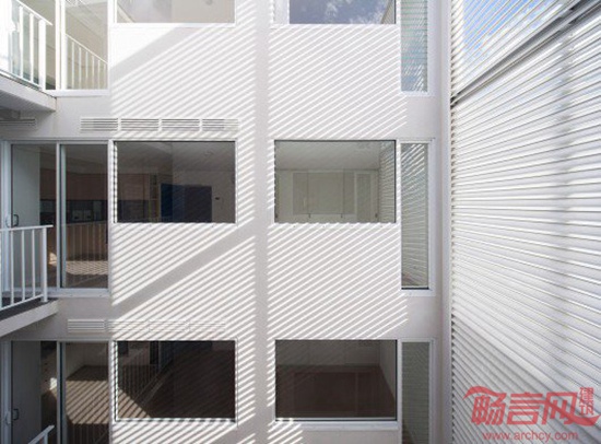 临街的建筑外立面阳台安装了百叶窗,使住户同环境发生了相互联系。设计师营造出的两个动感结构,围合成为封闭的圆筒,也可完全打开。遮阳系统实现了全自动化,可根据风雨等天气条件开合,增添了住户体验和舒适度。