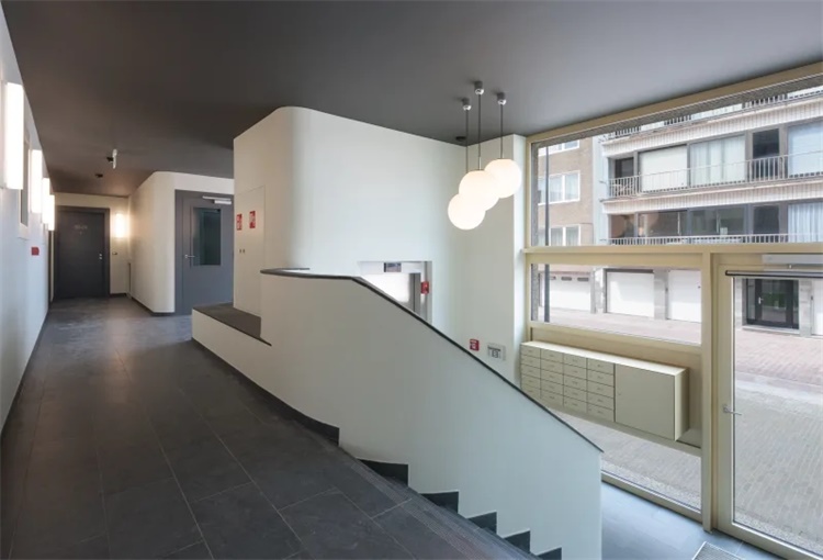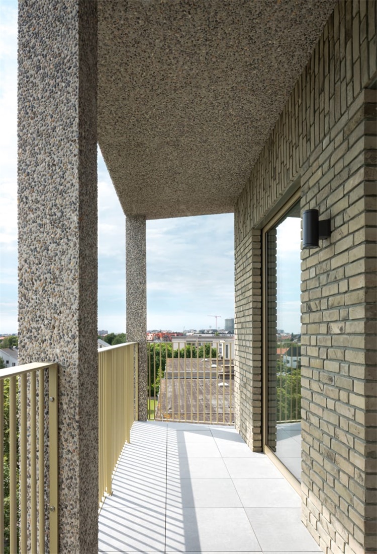 De Boeg老年公寓设有19套公寓。建筑位于比利时Oostende邻近海岸的住宅区内。呼吸着北海的空气,建筑设有灰绿色砖墙和灰褐色混凝土框架。梯形独栋建筑同周边环境文脉保持开放性。同时,建筑成为地区的一个特色存在,融入了城市肌理:坚实、洁净的伊丽莎白大道,精致而低调的Golvenstraat路。建筑具有独特紧凑的梯形外观,同坚固材料相结合,运用可持续建筑技术。在梯形建筑南侧,宽敞明亮的起居室和大阳台点缀着立面。大楼拐角处设有卧室。北部,交通区有助于居民有效地进入公寓,并灵活使用社区入口空间。该空间强调社交和公共互动,通过座位和等候区补充了室外到达空间。通过南面放置阳台,并用落地窗和法式阳台将其他立面连接起来,建筑与周围环境进行了对话,确保了建筑既牢固、私密又精致。