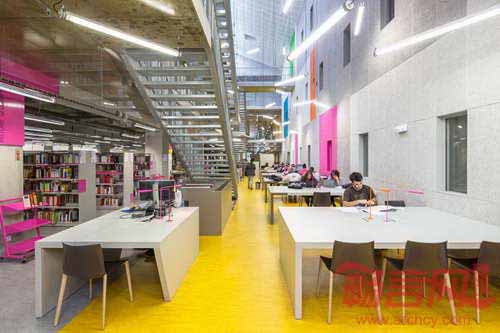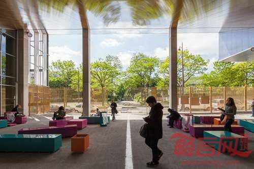 法国GPAA建筑事务所完成了巴黎索邦大学的Clignancourt中心项目的设计建设。项目为社会学、语言学和音乐学科学生提供资源,同时包含健身房、图书馆、500人大礼堂的公共功能空间。以上三大民用设施形成中心的三个立面,对照明显的材料凸显了功能差异。项目坐落于巴黎一块建筑密度较高的区域,运用引人注目的张扬色彩为单调乏味的城市景观注入活力。建筑的色彩运用有助于提供不同办公区域的空间向导。