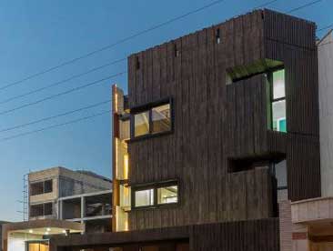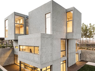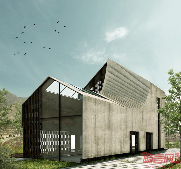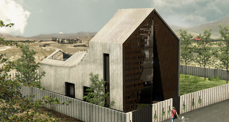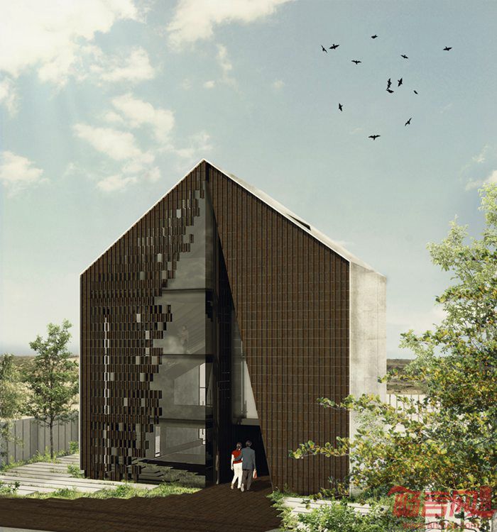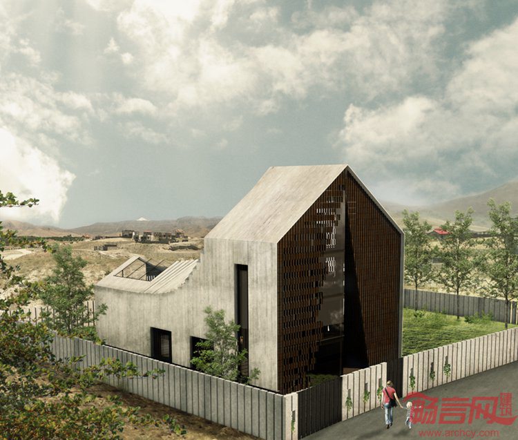 Habibeh Madjdabadi设计了位于伊朗Bathe的住宅。项目位于德黑兰东部郊区,建筑外立面呈现出典型的山形墙形象,即带有坡屋面的正方体。设计师将房屋原型进行扭转转变,认为“我希望创造具有标志性和特殊性的外形,而建筑师的任务就是将平凡变成不凡”。建筑主入口带有通向屋顶的开孔。在房屋右侧带有凹陷的窗户。左侧的四层高落地窗将室内区域同室外环境融为一体。