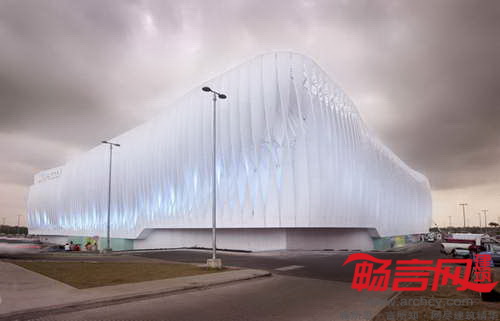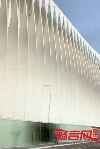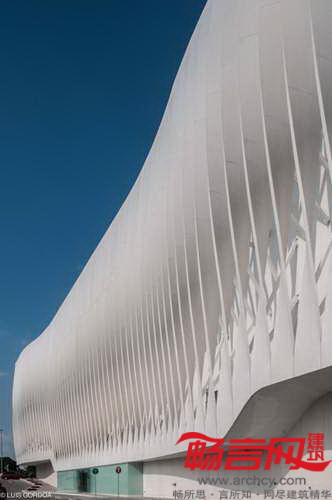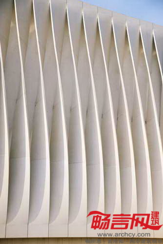 外立面的简单差别使各部分形态万千,在总体上造成流动的形象;如果隔开一段距离或在高速行驶的车辆中观察,外立面的视觉效果会更为提升;酸性饰面赋予了混凝土以颗粒质感和独特的外观。
