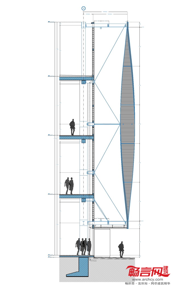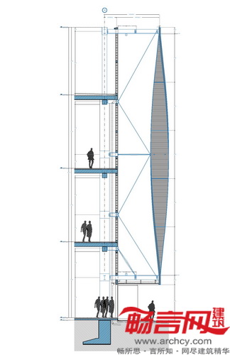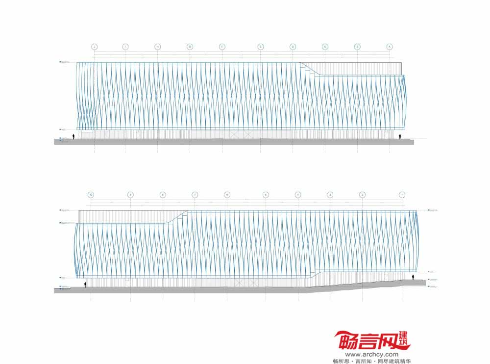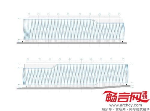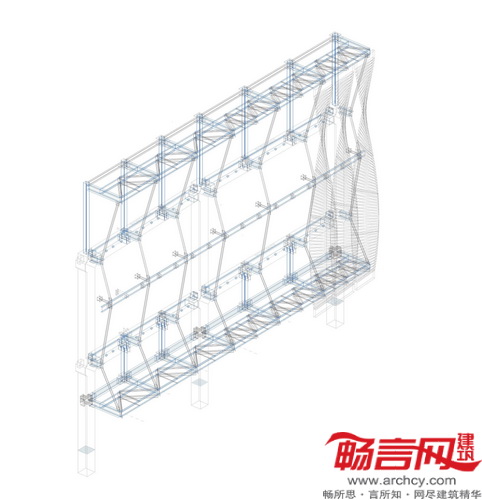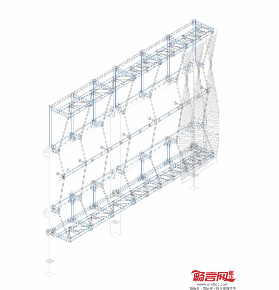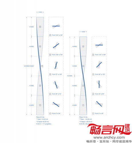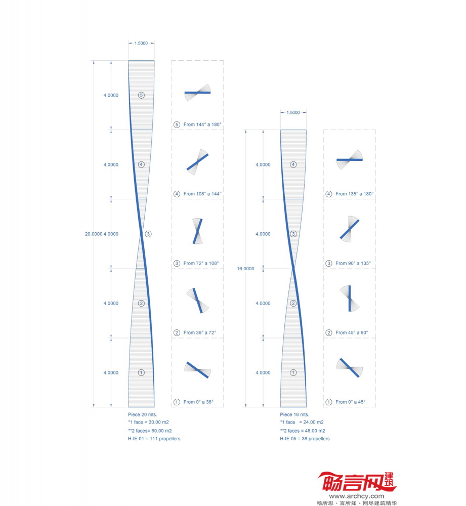最终外立面的设计方案中结合了五种不同类型的预制结构,外形类似螺旋桨。各“螺旋桨”根据各自的位置不同,高度介于16到20米间。