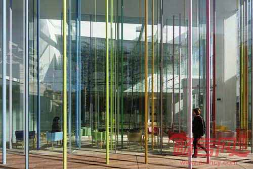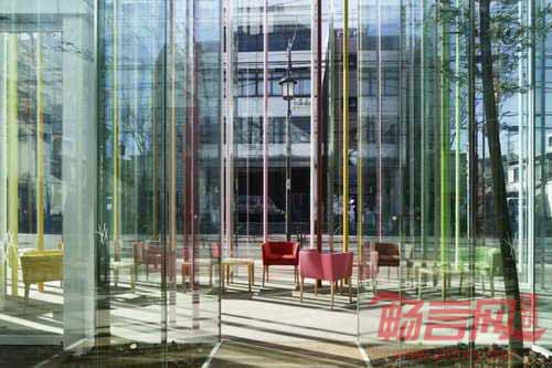 建筑从地界线后移了大约两米,木质平台边界区域上竖立了29条九米高的杆子,在透明幕墙上形成了投影,与室内随意设置的19条杆子自然融合。这种彩虹雨般的杆子为街道添加了缤纷的色彩,并回馈了部分空间。