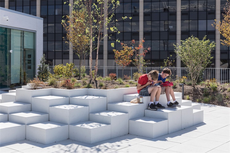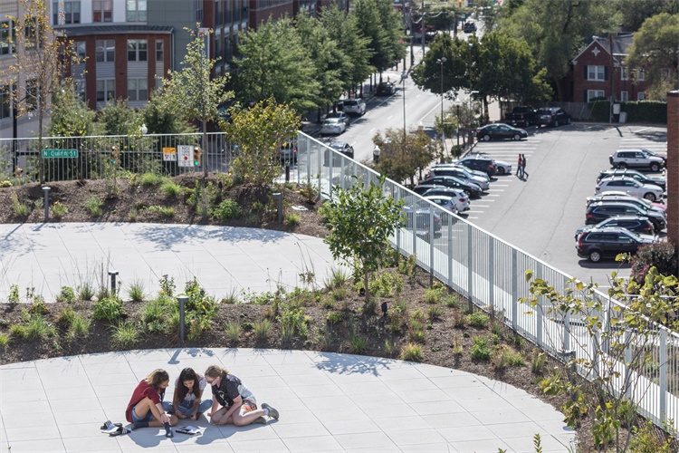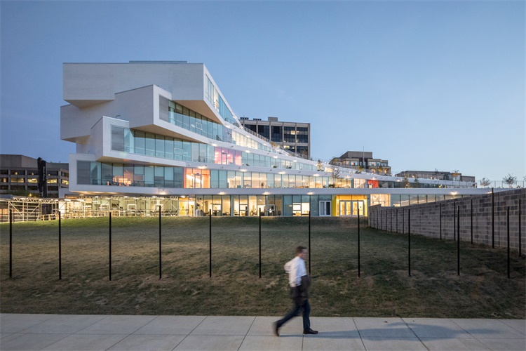 丹麦BIG建筑事务所设计了位于美国弗吉尼亚州的阿灵顿建筑。这是一座白色砖砌玻璃建筑,其折扇形状构成了悬垂露台。比雅克.英格斯设计的The Heights公立学校坐落在弗吉尼亚市一块紧凑的基地上,距离华盛顿特区30分钟路程,周围被三条道路和Rosslyn高地公园环抱。