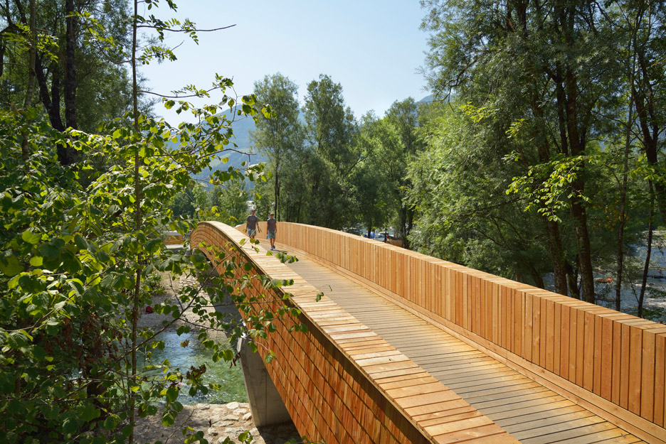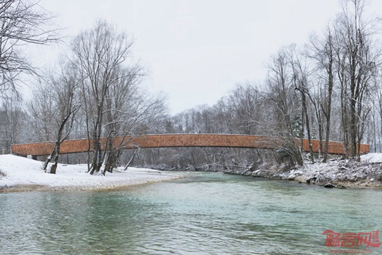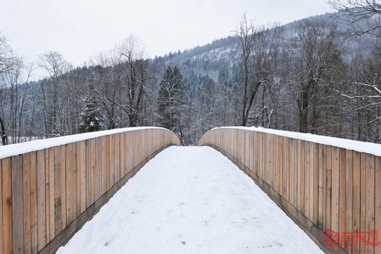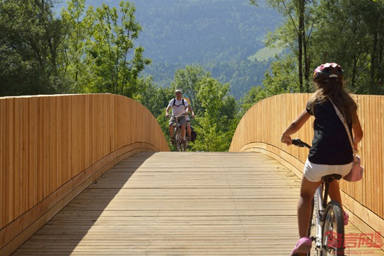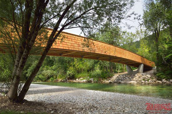 DANS建筑事务所利用木板材和护墙板营造了位于斯洛文尼亚的步行桥和自行车道路,将一座村庄和附近的湖泊山峰连接起来。桥梁立于Sava河上方,长达54米,是一个Bohinjska村自行车道路的一部分,终结于Bohinj湖。设计师表示,桥梁通过搭建一条前所未有的路径,营造了新的空间关系。虽然听上去简单,桥梁却触及到多种层面上的意义,因而桥梁在历史上对人们有着特殊重要性。