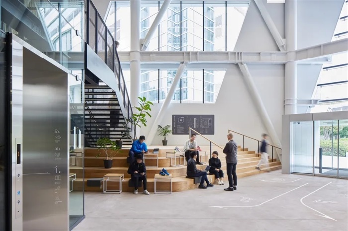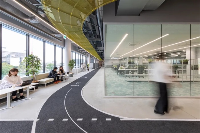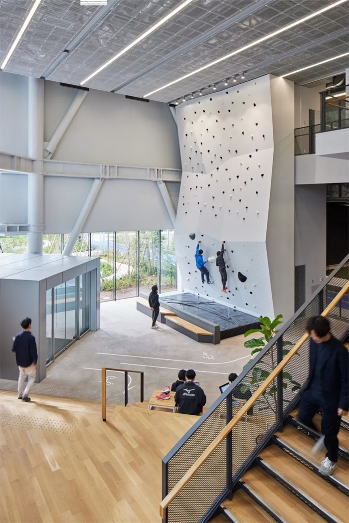 人工草坪、跑步机、体育馆等用于“测量、制作、测试”的实验测试区以跑道为中心互相连接,来访者可以从中间层的体育吧(Sports Bar)看到这些区域的活动。入口和体育吧被定位为对外交流的场所,可以进行公开展示,仅以栏杆和挑空等方式软性隔开通常被施以严格安保隔离措施的研发空间。对于正在将业务领域从体育运动扩展到整个社会生活的美津浓而言,该项目不仅实现了其所追求的开放式研发环境,更有助于推动与外部的合作发展。
