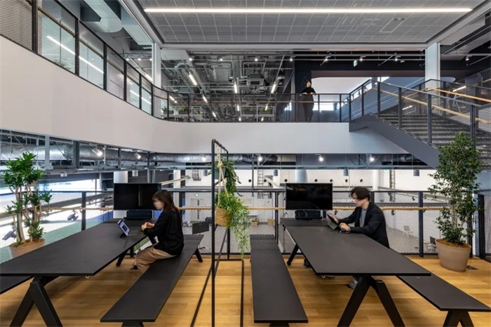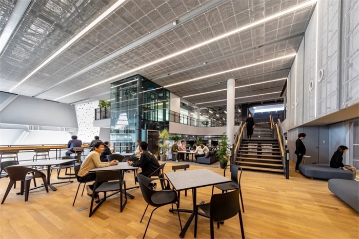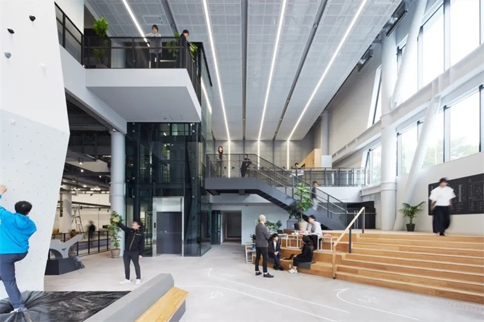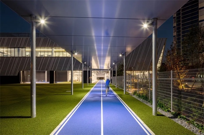 低层研发中心只有两层,1层的实验楼层和2层的工作楼层通过中间层的交流空间体育吧相连,形成开阔连续的整体结构。实验楼层中间跑道的正上方是挑空空间,因此奔跑而过的脚步声和运动氛围会响彻整个建筑。从工作楼层可以直接看到和听到人工草坪上棒球、高尔夫球以及体育馆中球类比赛等的实测情况。日常中运动与工作的相互交融,成就了这个在人与人之间建立联系和实现“测量、制作、测试”高速运转的一体化空间。