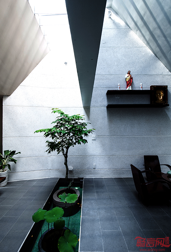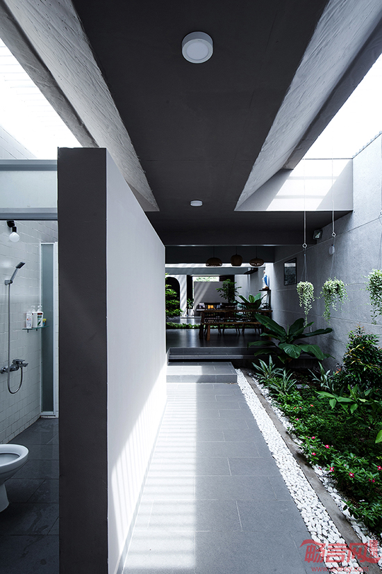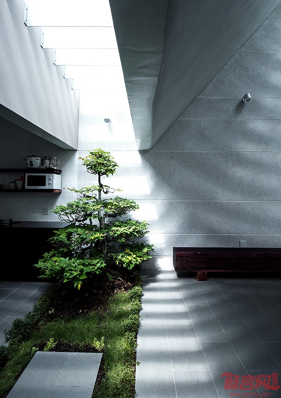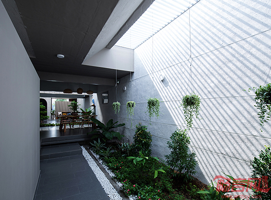 这座民宅建在一片5x40米的狭长土地上,为了给业主营造一个安全舒适的港湾,建筑师尽可能地考虑了自然光线的照入,并且在小型的室内花园中栽种了绿色植物。