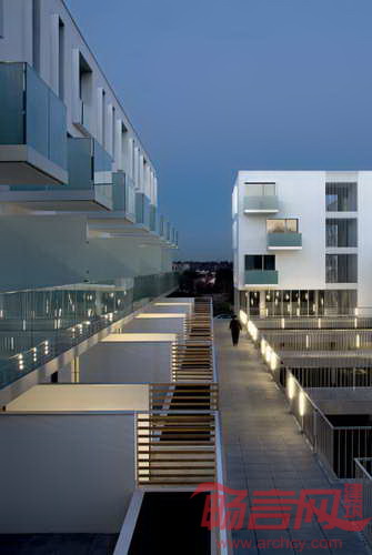 庭院周围是四座建筑。东南面二层位置有一系列宽阔的走道,通往设有宽敞露台和阳台的住宅单元。