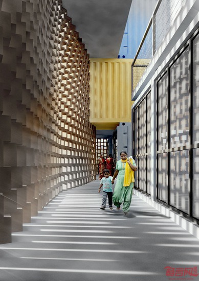 Ganti Asociates设计公司赢得了一项国际理念竞赛优胜。该公司除了一个集装箱摩天楼构想,为孟买Dharavi贫民区提供临时住宅。设计师考虑到钢制集装箱可以叠放到10层高,无需其他之城,因此创造了高度超过100米的高层建筑,主体由自支撑的集装箱组成,每八层由钢制格栅分隔。