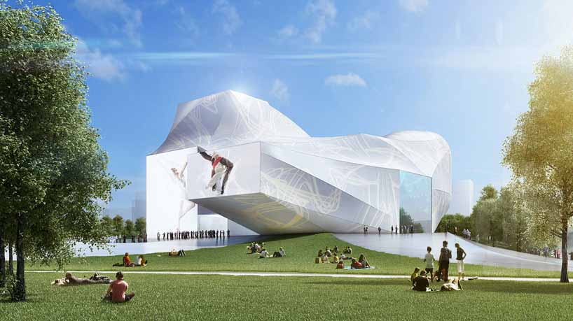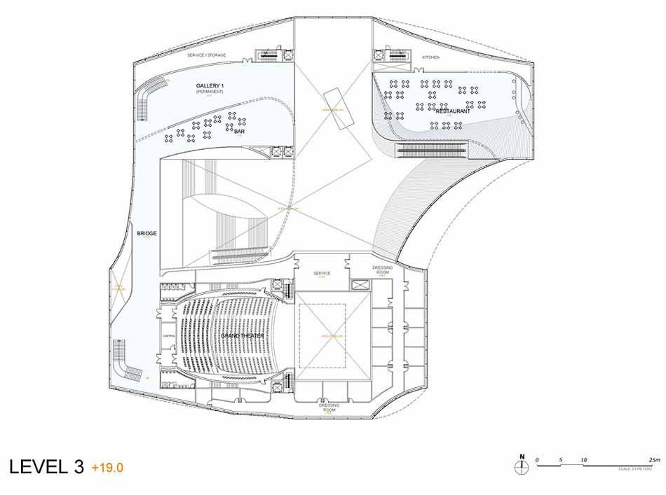 韩国世宗表演艺术中心活跃了建筑周边的城市景观,渐近型建筑反映了城市日益深厚的文化程度。在单体建筑内,中心设有多种功能设施,体现了当代城市生活的灵魂。强悍的球茎形式具有友善、亲和的姿态,两个入口沿对角线将建筑几何体切开,起到扩大人员流量的作用。周边景观烘托了公共入口,也重新定义了周围的城市景观。从主入口前的大广场,人们通过一个高大的玻璃幕墙,可欣赏到建筑的内部空间,从而营造了表演者和公众之间的互动性。建筑参考了附近寺庙的曲面结构,是对世宗古建筑的重新诠释。