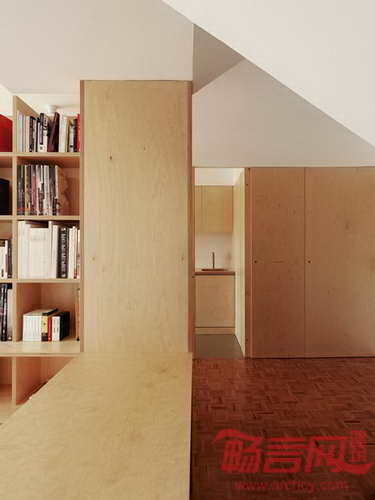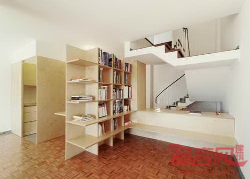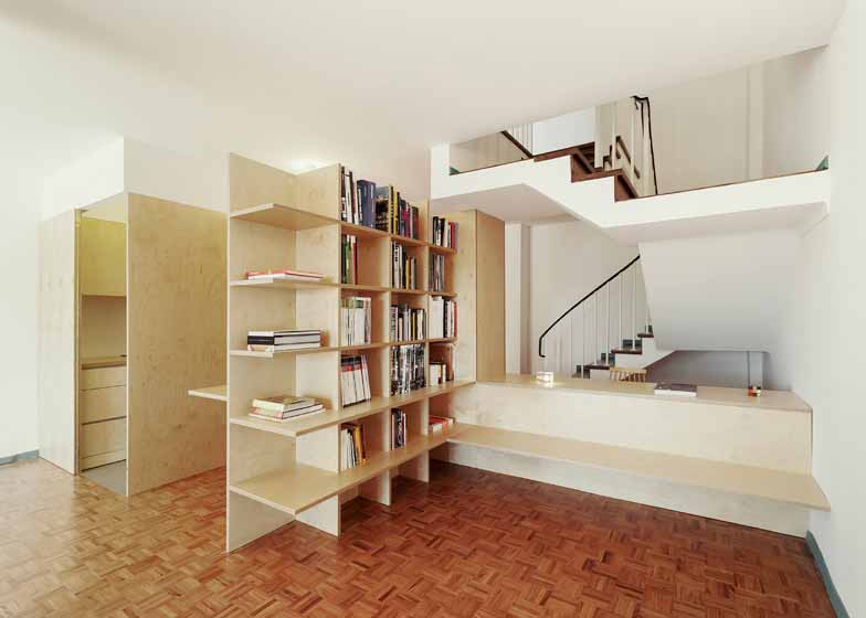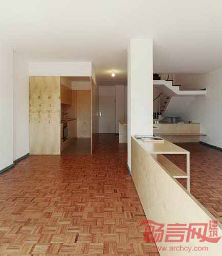 建筑师Joan Branco将葡萄牙Coimbra一座办公建筑改造成住宅,安装了一个具有储存、隔断功能的木质元件。设计师将项目概念成为“接近木工活而非建筑构造”,为一层空间引入三个木质单元,营造起居室、餐厅、书房、厨房和卫生间。设计师表示,“设计意图是使光线流动,创造半透明的空间,增建空旷感。”第一个木质元件位于玄关旁边,创造出供两人使用的书房区域,同时开辟出衣帽间、书架、置物架。