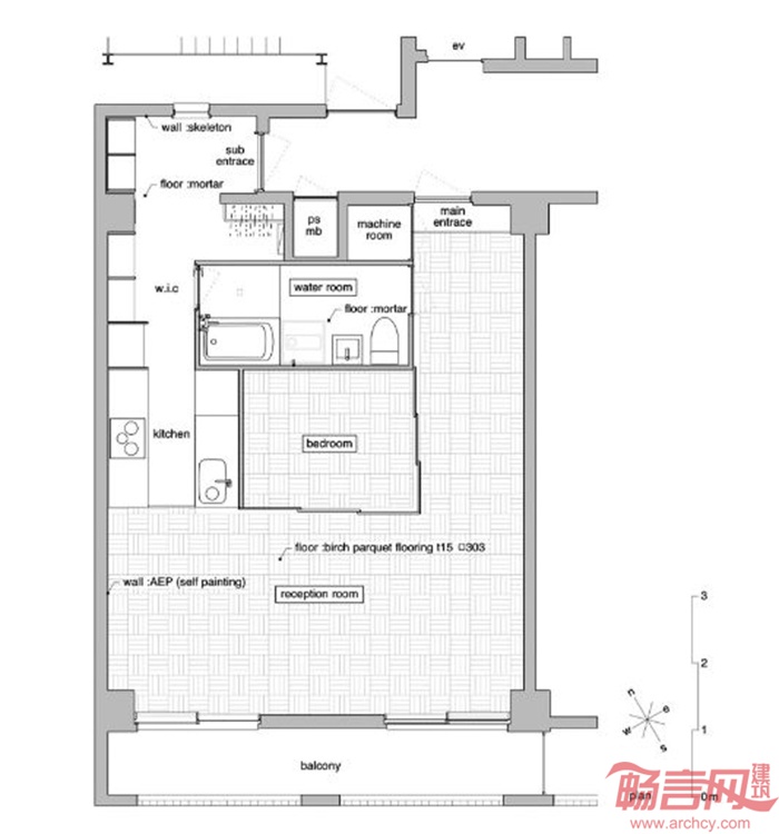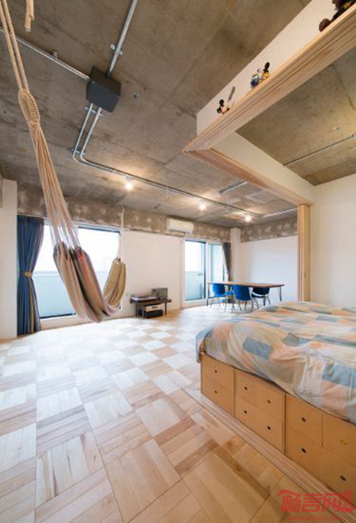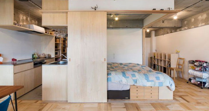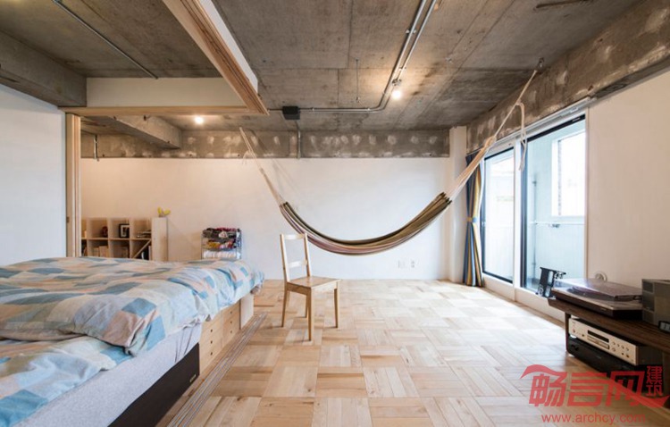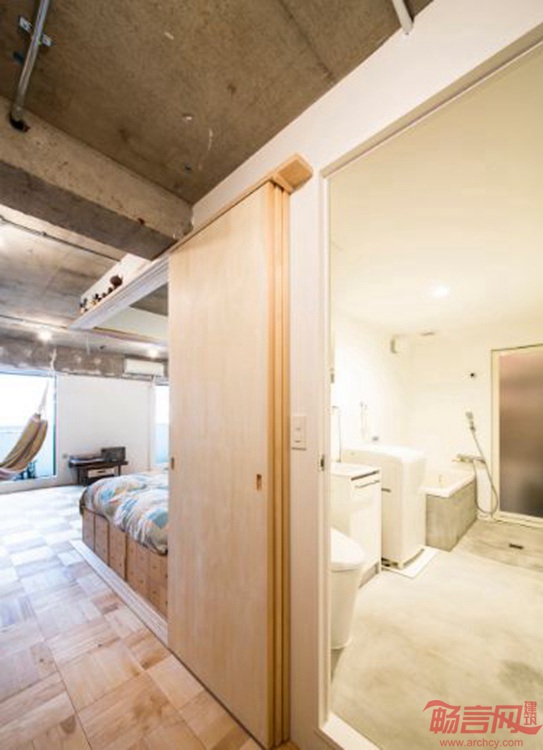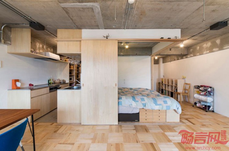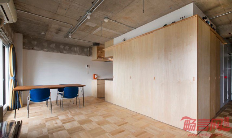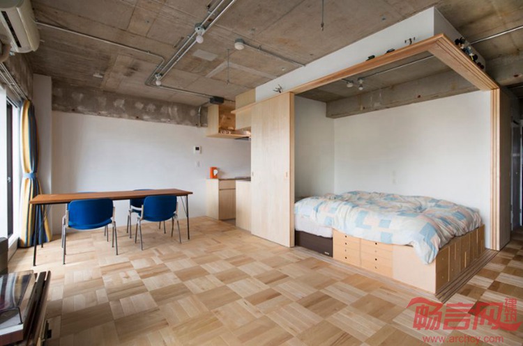吉田裕一建筑设计事务所设计了东京筑地公寓。项目面积47平米,于2014年完工。原先这套两式公寓将用于办公用途,现在业主将其改造成单人公寓。除了保证基本居住功能,设计师希望增强室外区域的使用可能。此外,设计要考虑到未来五到十年房屋出售或转租的可能性。设计使用了分区的概念,使得项目不仅用于居住,也可用于居家办公或者办公室,这种功能的丰富增加了其商业价值。