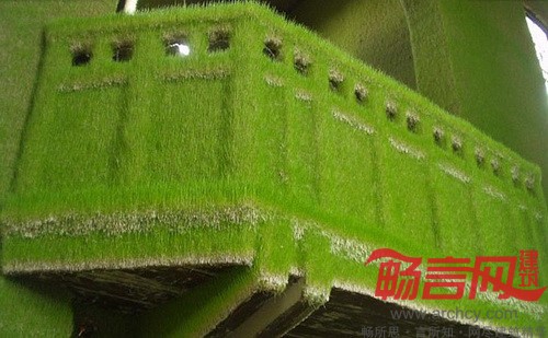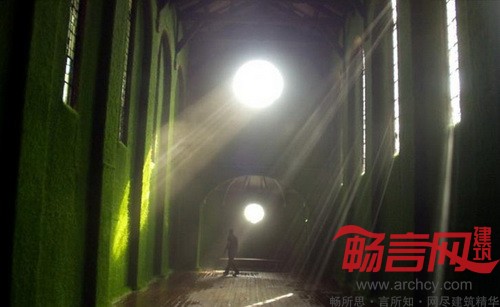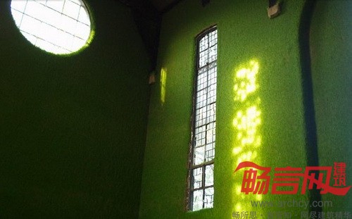 设计师将草籽与粘土混合,涂抹到教堂内墙、阳台和天花板上,之后就长出了绿茸茸的青草。教堂内部有自然光线透进来,再加上软管灌溉系统,为青草提供了很好的生长条件。