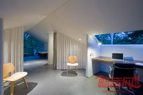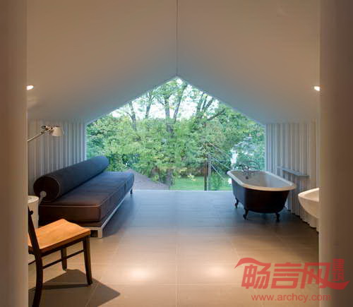 PARA Project公司将纽约一座阁楼改造成光线充裕的书房和客房,营造出宛如都市隐居地的氛围。项目名为“Crawford阁楼书房”,业主夫妇分别是作家和装订商,要求拥有用于写作和存放大量书籍藏品的空间。项目采用开放式设计,划分出若干区域。重要交通路径环绕空间中央,充分利用了挑高屋面。斜坡屋面较低位置容纳了写作区,分别设有书桌、座椅、沙发椅和猫脚浴缸。客房套间设有无框后窗,另外一端是书架。