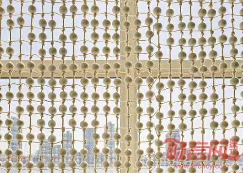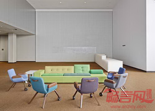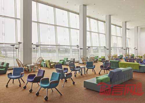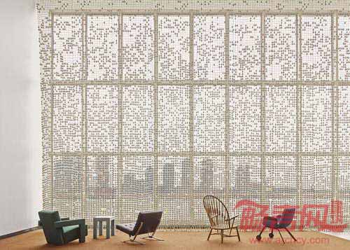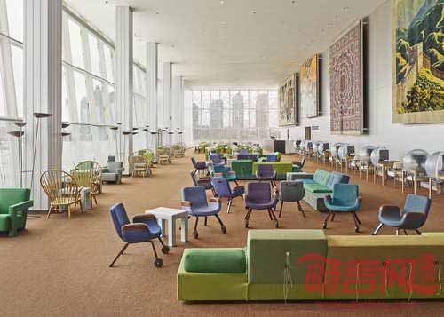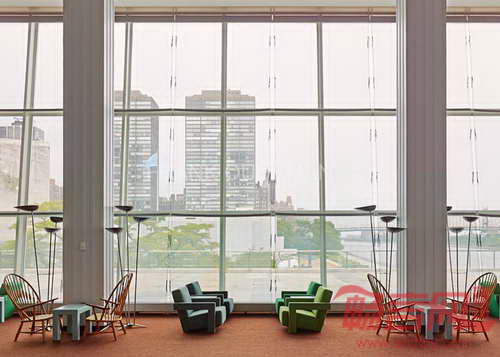 设计师Hella Jongerius和建筑师库哈斯完成了纽约联合国大楼代表休息室的翻新改造项目。两位设计师同一群来自荷兰的创意艺术家合作,重新设计了休息室的布局,并添加了新的家具。该休息室于1960年代、由柯布西耶和尼迈耶设计,是联合国综合体建筑中的重要建筑空间。库哈斯首先将1978年添加的夹层进行了移除,使空间重新获得朝向东河的视野。Jongerius采用3万枚瓷珠和手工纱线,设计出一面精致的珠帘。家具的选取遵循了项目区域功能的差别,其中一端是正式会议区,另一端是休闲咖啡茶饮区。Jongerius设计了两款家具,分别是Sphere桌和UN休息室椅。