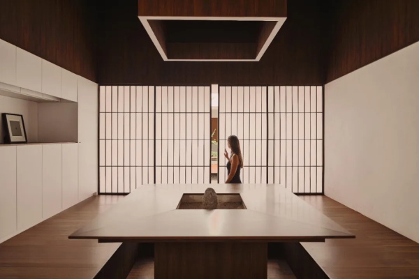 花园是空间的组织者。石头被精心布置,不是为了表现什么,而是为了唤起一种感觉。两块木制平台漂浮在灰色砾石之上,如同寺庙中的停顿空间,让人驻足、凝视。厨房与用餐区拥有两倍层高,客厅则是沉思的空间,两者之间由一条无遮盖的走廊连接——下雨时穿过会被淋湿,或者等待雨停。门窗采用米纸,使光线变得柔和,阴影成为光最细腻的形态。上层卧室仅以一面圆窗朝向树冠,宛如凝视的眼睛。