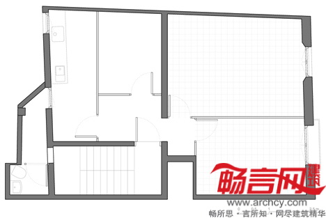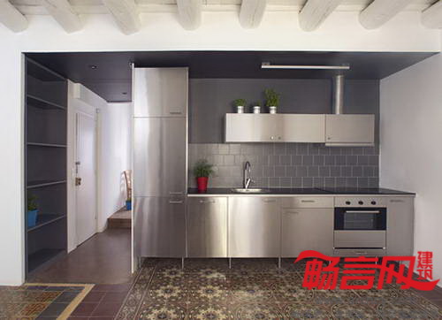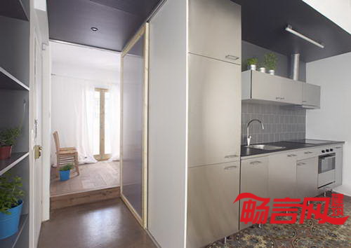 厨房位于连通式的起居室和餐厅的拐角,另一侧的洗手间则位于卧室对面。