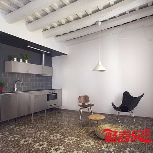 由西班牙设计工作室 Nook Architects 设计的本套巴塞罗那公寓将现代化的厨卫设备、原有马赛克地板和袒露的木制顶梁融为一体。