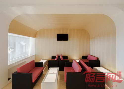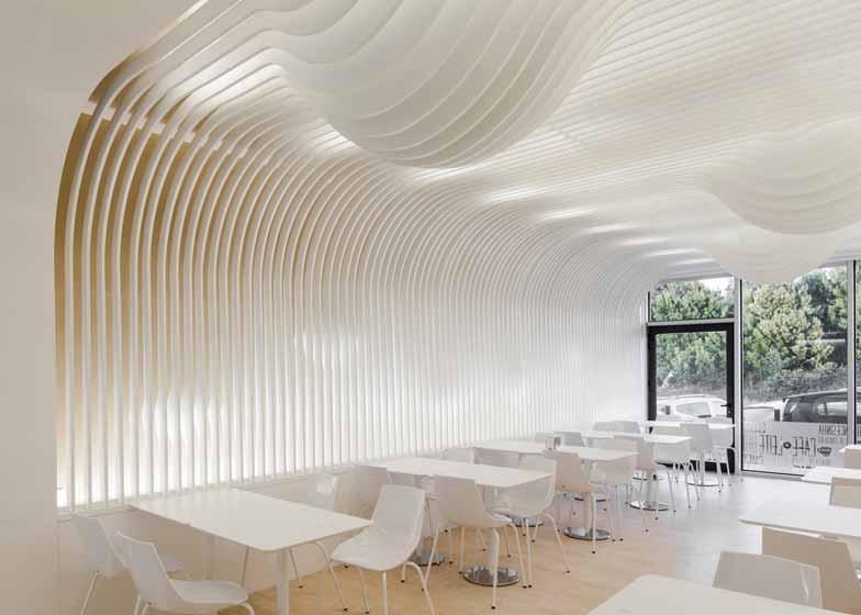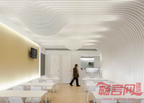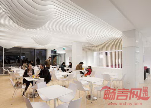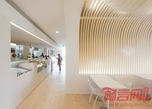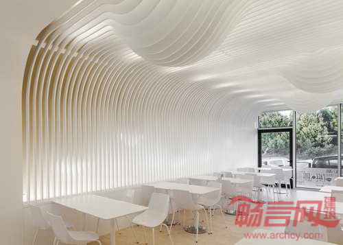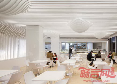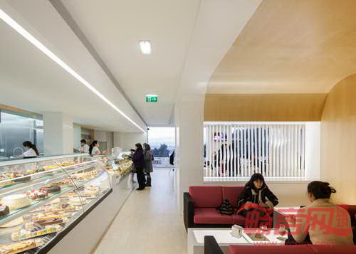 葡萄牙建筑师Paulo Merlini设计了位于波尔图的一所面包房,流线型的天花板如同蛋糕顶层的奶油。设计师安装的条形天花板有两个功能:其一,减弱上方灯光照明的刺眼程度;增强面包房内的音响效果。木质镶板从天花板延伸至墙面,其形状抽象地契合了Merlini设计的面包房新Logo标志。面包房内部包含三块独立区域,分别由不同的座位设计,客户可以根据心情选择喜欢的用餐环境。