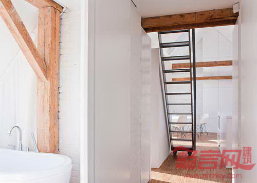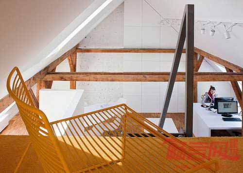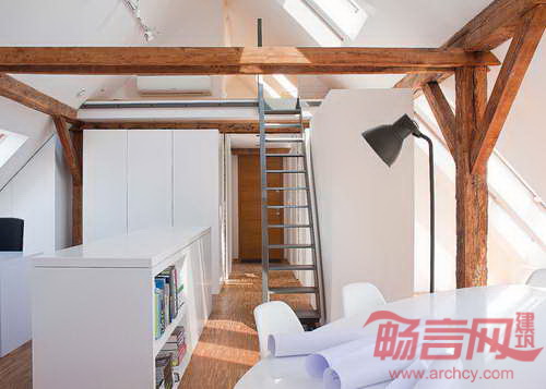 阁楼的坡屋顶使得设计师能够将夹层空间设在椽子下方。金属楼梯通往楼上空间,与滑动结构链接,因而在必要时可以旋转至另一方向。阁楼首次添加了17扇新窗户,带来充足光线与景观视野。