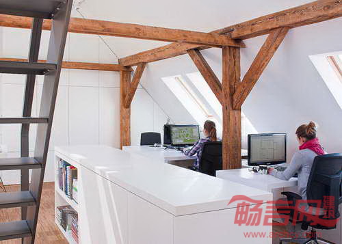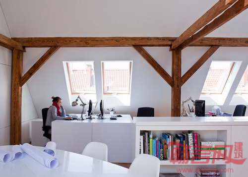 PL建筑事务所在波兰Poznan设计了自身的阁楼工作室。工作室位于老城区,翻新的阁楼为事务所提供了两层办公空间,具有暴露的木质桁架和粉白墙面。设计师表示,“工作室里的所有事物都不设伪装,我们所见的只有现代设计或者建筑的原有结构。”