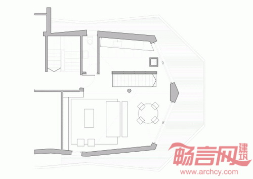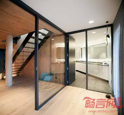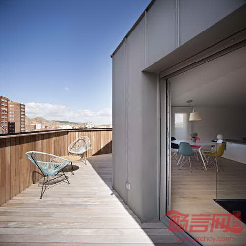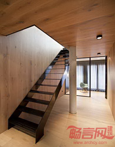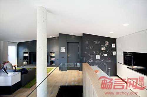 由于与传统复式公寓的楼层使用相反,项目采用了非传统空间解决方案。主要通道和社交区域位于二层,卧室和更多的私人区设在一层。主要通道形成社交区域的延伸空间。无缝连接的两区提供了开放的概念客厅,与之融合的是一个大木地板露台。