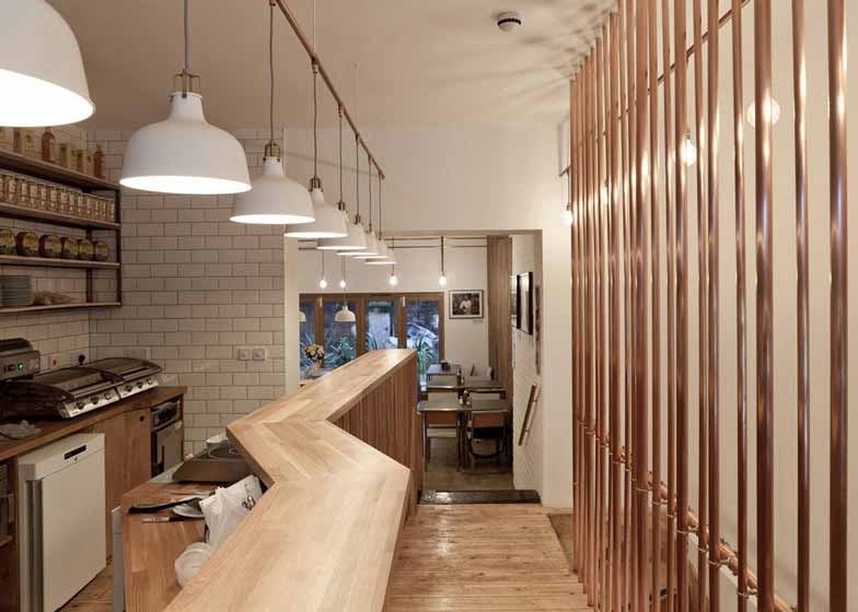 Twist In Architecture建筑事务所设计了位于伦敦东部商业街的Trade咖啡厅。室内空间装饰元素包括铜管、木板、金属管,旨在纪念该地区的贸易历史。咖啡厅在一块破败空间基础上改造,保留了原有三块独立区域,功能分别用作展示、制作咖啡和食物以及顾客座位区。设计师表示,此次改造运用所在街道上商户曾经售卖的材料,创造赋有环境责任感的内饰。咖啡馆中央装有若干铜水管,用作隔断屏风,同时遮盖了胶合板材质的柜台。铜水管还出现在楼梯扶手以及吊灯支架上。