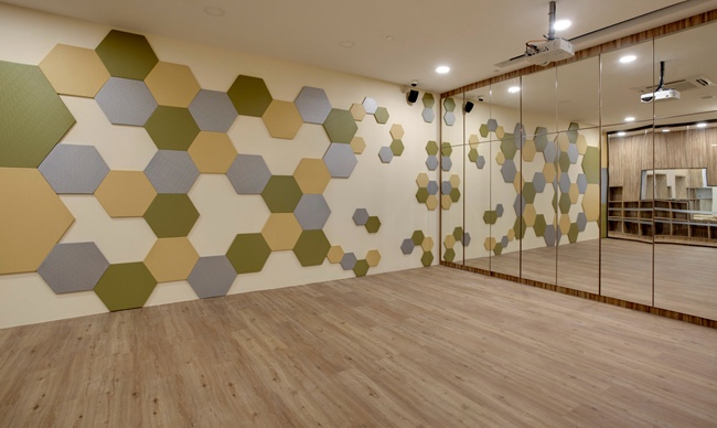 六边形是自然界里最有效,最不浪费的结构。该形状的压缩特性使其成为世界上最强大的结构之一。相比较其他形状,蜂窝的几何形状可以用最少的材料来创造更多的空间。使用蜂窝型结构不仅可以节省材料,也能增加吸音效果,使音乐和舞蹈教室有更好的隔音性能。