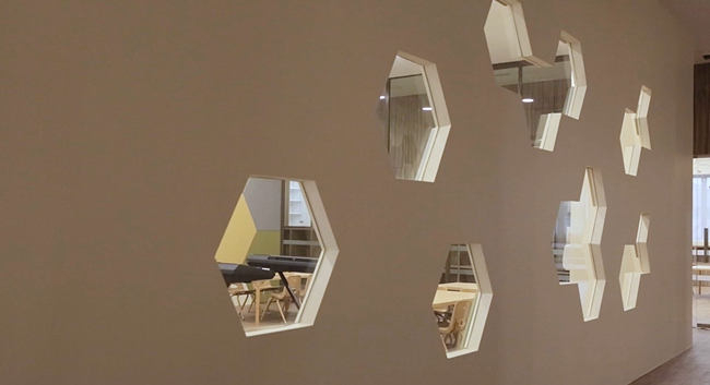 此外,墙面的六边形选用了三种颜色,有青春朝气的绿色,积极向上的黄色和象征平缓安静的灰色。运用这三种色彩的淡色系,给孩子们带来舒缓,放松的效果。