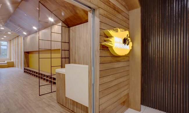 新加坡南洋艺术学前教育学院(NAFA Arts Preschool)坐落于新加坡的艺术遗产区域中心,由新加坡SODA设计事务所(spirit of design analogy pte ltd)设计师Tung Ching Yew(张进耀先生)负责设计。其灵感来自幼儿保护区的定义,被设想为城市环境中的 “儿童避风港” 。建筑环境旨在通过新型的多孔墙来代替传统的教室,使用由几何图案组成的带有凹凸感的多孔墙,来唤起儿童的好奇心与探索欲。因此,它自然地创造了学龄前儿童之间互动机会。其他特色空间包括艺术空间,舞蹈室,音乐室,都以开放模式设计,以便在整个空间布局中实现无缝的视觉连接。该项目获得了多个国际奖项,其中包括第12届美国IDA国际设计奖室内设计公共机构类别银奖,2018年新加坡室内设计比赛SIDA 公共类别金奖,2019年亚洲设计大奖ASIA DESIGN PRIZE铜奖等。