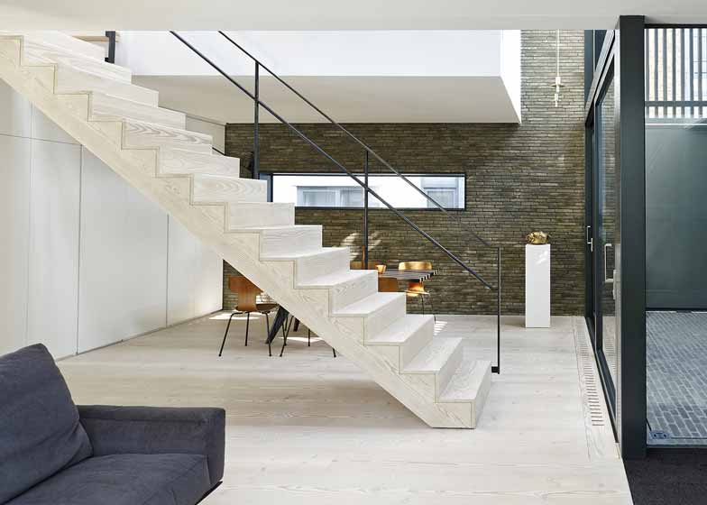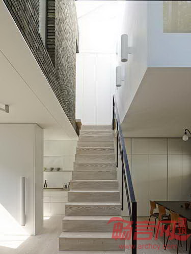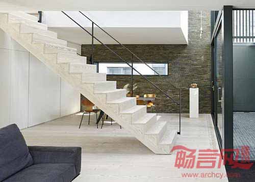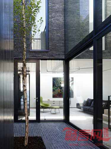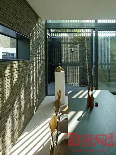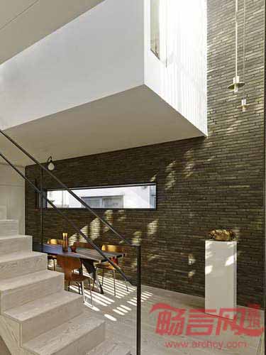 项目位于伦敦Hackney区,深色的砖墙将室内外区域连接起来。住宅的一侧是Form_art建筑事务所办公室,设计参照了其周边的砖石建筑,通过玻璃庭院和天窗将阳光引到室内。设计师表示,“传统建筑的窗户较小,光照不足。为了避免这种情况,我们注重考虑项目采光,同时也尊重项目所在的环境语言。”从街道角度看,建筑呈现出黑色的窄条比利时砖块外立面,窗户狭窄细长,黑色木门巧妙地掩饰了入口处。