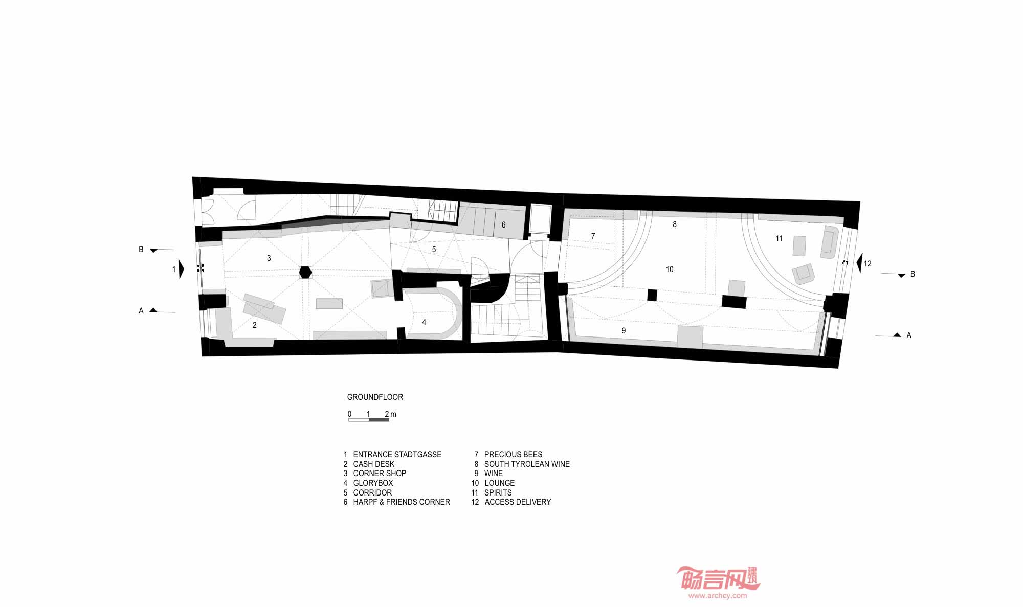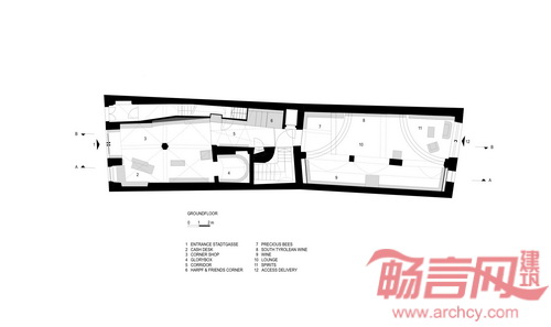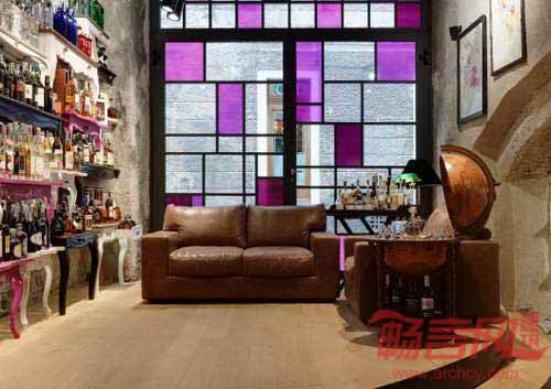 Harpf酒品商店的设计目标是营造品赏美酒、熏陶文化的社交场所。商店的前端和后端分别具有不同风格。依照这种理念,商店的入口区域采用传统街角商店的模式,设计非常注重细节处理;商店后端的古老建筑精华与现代理念的得到结合。商店将略微破旧的家具进行了艺术性陈列,赋予遗迹气势非凡的氛围。同时,商店设置了Harpf老友角,除供应饮料和食品外,还容纳一个图书馆,邀请顾客小坐。从墙上照片可以看出商店的历史可追溯到1919年。