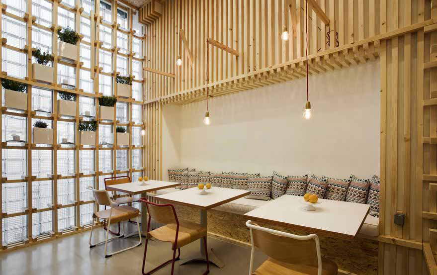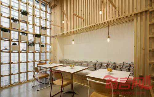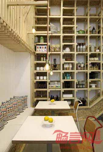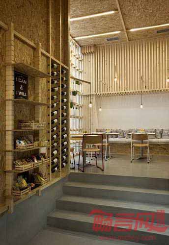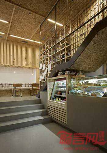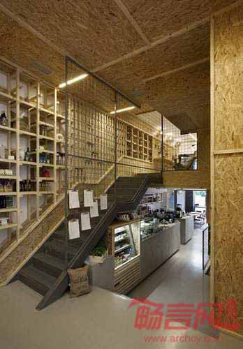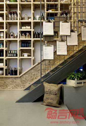 咖啡厅最醒目的元素是无数个木框,用于存放或展示食品。店中墙壁和天花板覆盖了硬纸板。简单低成本的装饰物件同包装箱别无二致,造就了简约低调的空间风格。