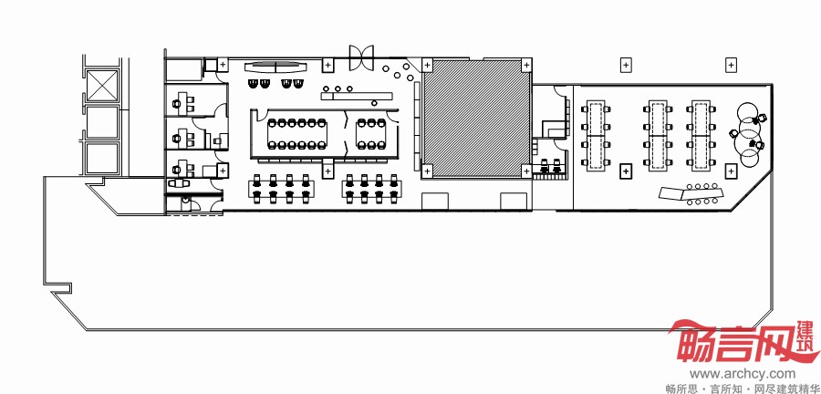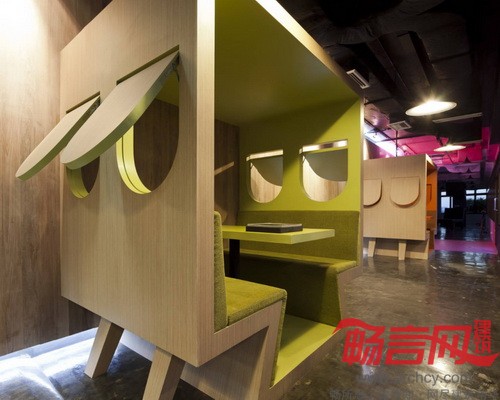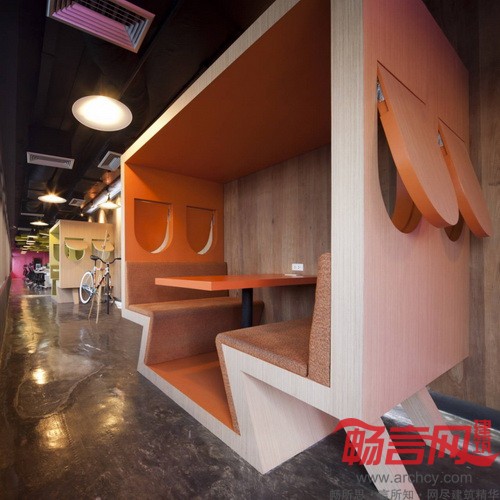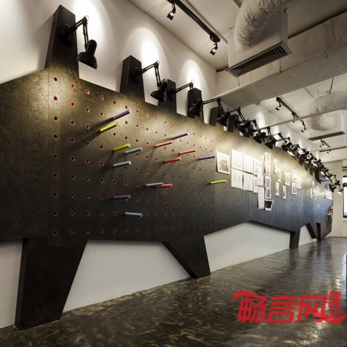 “我们还模仿火车座位的形式设计了一些小型会议区,这些会议区具备很好的私密性,其外观各也不相同,”设计师说:“另外,我们在创意区的一面墙壁上打造了一片形状怪异的信息墙,从而取代了那些常用的悬挂在墙壁上的方形信息板。”