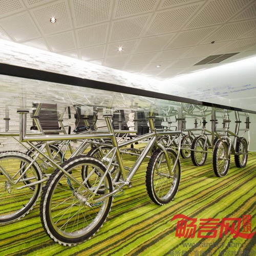 在这两个区域中间,有一面有趣的挂满奖品的墙壁和一面挂自行车的墙壁。办公室设备区域的墙面被刷成粉红色,为沉闷的工作程序增添了些许活泼的气氛。