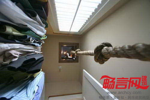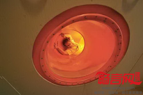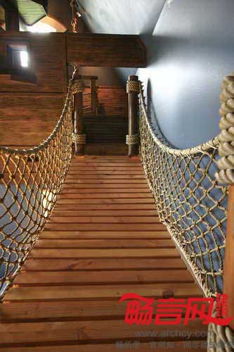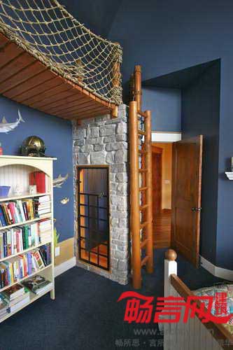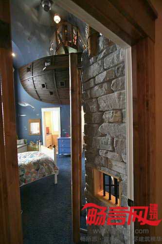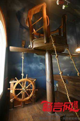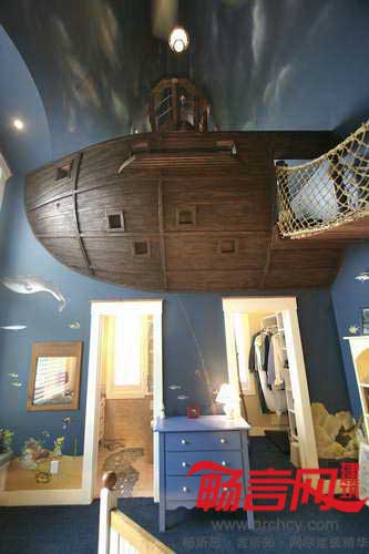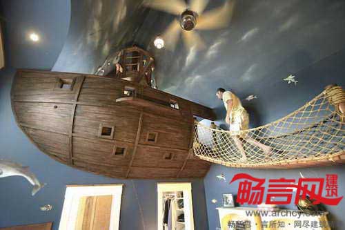 由Steve Kuhl设计,受海盗激发灵感的卧室几乎满足了所有年龄段海盗迷的梦想。卧室的设计构思独特巧妙,人们可以抛开一切恐惧,重新变成孩子:从墙面上的孔洞上滑下,能抵达实际的卧室,碰到柔软的枕头。起身后,目光会立刻被一个奇幻、如童话般的结构吸引:天花板吊起的一只巨大的海盗船。通过带有绳网的木桥可以进入海盗船,其顶部有一个鸦巢,旁边是供客人使用的床铺。鸦巢使用一个十英寸原木手凿而成,由一条绳索连接到更衣室。设计师是这样创造海盗船的结构的:“我们用2*12的木头制作船身,上面覆盖1/2英寸的胶合板。我们天才的仿真涂装师发明了一种石膏和环氧树脂混合物,并配合颜色处理,模拟出旧船身效果。”还有另一种进入卧室的途径:通过一扇隐藏了海洋魔幻王国的门。进入房间的人都必须经过精钢材质的牢房门。毋庸置疑,这个不可思议的设计能让孩子在创造性的环境中成长。