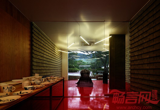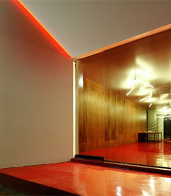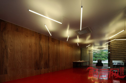 室内空间设计别具特色。从材料来说并没有特别之处,地面采用的是普通的聚氨酯,墙壁采用的是普通的木质饰面和砖块,在此条件下,能够体现新意和独特的就是砖块的铺设方法。对这些常见材料的不寻常用法创造了不一样的空间。此外,灯光布置也很独特,而材料不过是普通的荧光灯管。