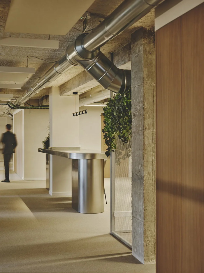 鉴于天花板高度有限,空调管道、通风系统、电气与数据线路等设备均采用裸露式设计,再辅以不锈钢材质、喷涂保温天花板和自然木材,营造出年轻、科技感强烈的氛围。这种偏冷、工业感的材质体系通过丰富的绿色植物和橙色、黄色等鲜艳色彩的家具软装得到中和。