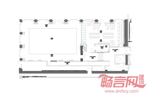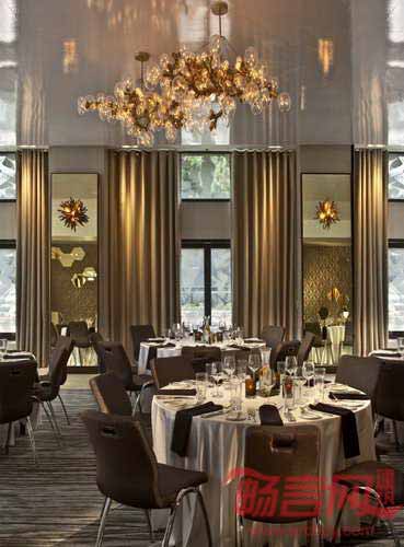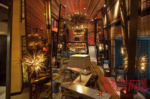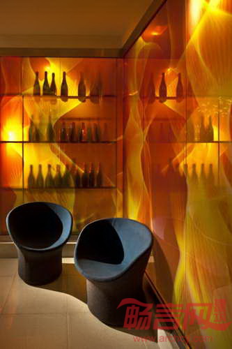 Kelvin餐厅旁边的走道营造出另一个夕阳主题场景,从橘黄玻璃墙面向外袅袅升起了烟雾。酒吧带有一丝海洋凛冽的色彩,与室内其他部分光亮的橙黄色彩形成对照。