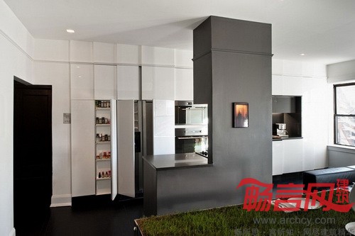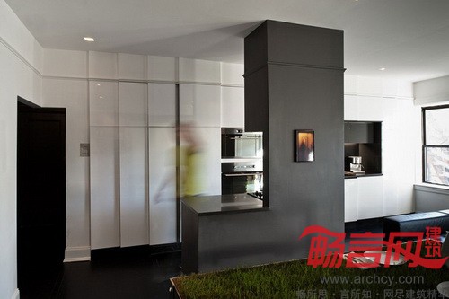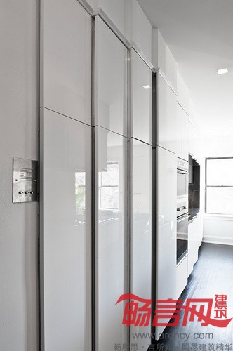 “为了扩大室内空间,我们将一些平时较少用到的空间都整合到墙壁里面了。”设计师介绍说:“通过将办公区、图书馆和厨房等功能区域压缩到墙壁中,居室空间比原来扩大了1倍。”