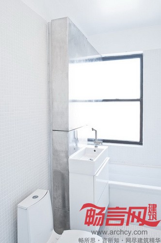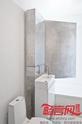 设计师在浴室里设置了一面抛光铝制墙,将储物间和淋浴间隔开;由于淋浴间正对着一扇窗户,于是设计师将这面铝制墙延伸到了淋浴间和窗户之间,这样既保证了淋浴间的私密性,而且抛光铝板也能将从窗户透进来的光线反射到室内其他区域。