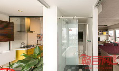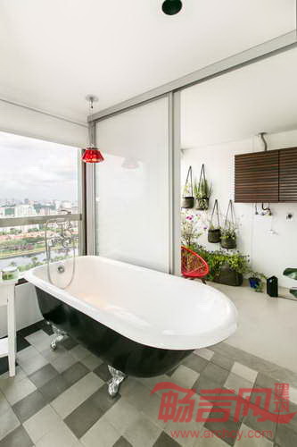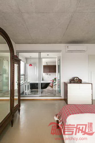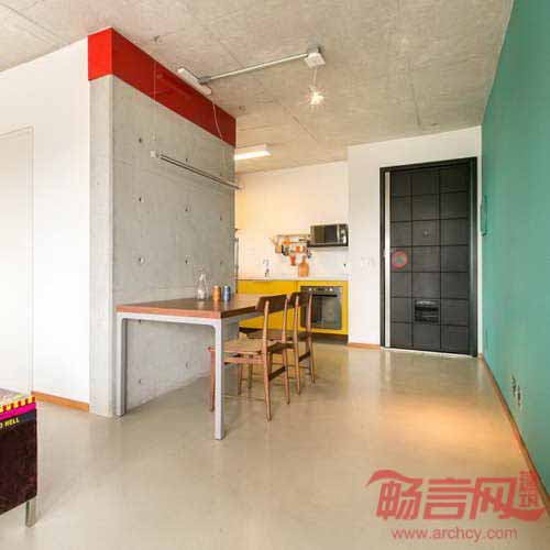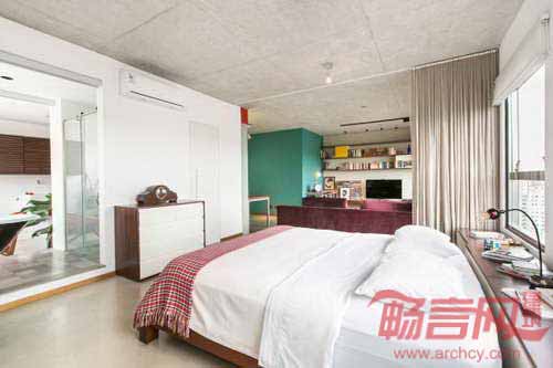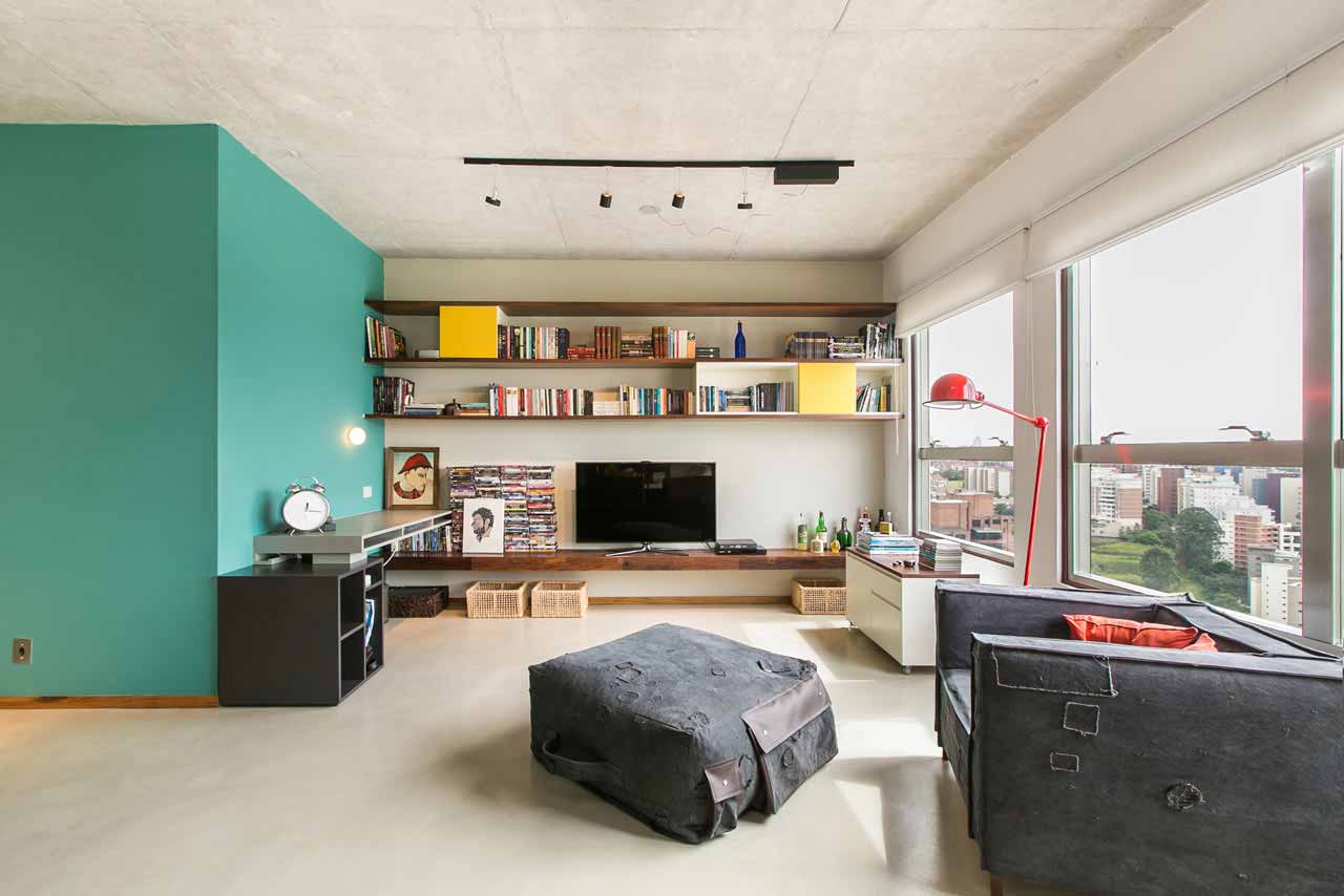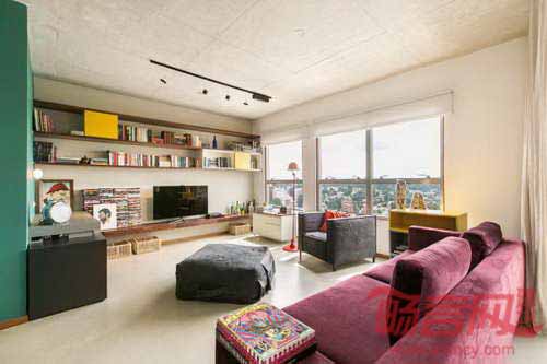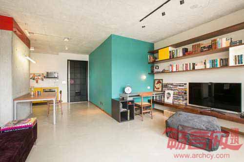 DT建筑工作室设计了位于巴西圣保罗的Panamby公寓。设计师和业主——一位单身律师共同构想了室内设计。由于仅有一名住户,私密性不是关注点,因而采纳了开放式布局。浴室成了室内唯一部分隔绝的空间。公寓最大特点是质朴原材料的广泛使用,混凝土、木材和织物为设计奠定了基调。房间地面、天花和墙面全部采用混凝土,配合缤纷织物,创造了家居、工业风格混搭的空间。