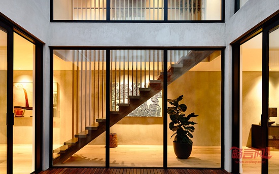 在别墅一层中央,是一个玻璃围墙的天井,围绕天井布局了书房、厨房和客厅,天井旁边有一个手工制成的木质楼梯。