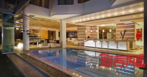 主人可以从主卧室直接跳进游泳池,然后游到运动馆,返回时也可以游过泳池,然后通过玻璃楼梯回到主卧室!